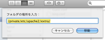 そこから、Apacheの設定ファイルである、httpd.confを編集して、php_moduleがコメントアウトされているのでそれを外せばいいのだが、ここで、問題があるのだ。実は最近知ったのだが問題はなかった。Finderで「移動→フォルダへ移動」でUnixアドレスを直接入れると可能で見えなかったファイルが見えるようになる。保存時に認証が毎回発生するがGUIで編集できて便利。