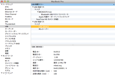 いまひとつ、よくわかってないのだが、繋げば普通に認識されるそうだ。CDC(Communication Device Class)というのが標準クラスで、それに対応していると標準ドライバで認識されるらしい。で、UnixとMacはそうなるらしい。