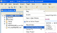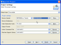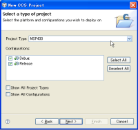 CCSのプロジェクトのタイプを選ぶんだが、ここで、Releaseだけ選ぶと、デバッグモードにならないのかな。不明。プロジェクトの設定で、ターゲットのデバイスを設定してFinishする。