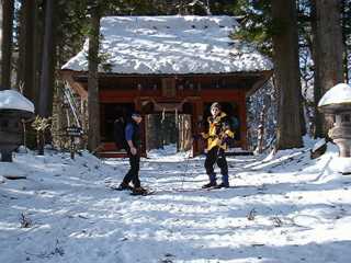 戸隠神社の奥社の山門です。シーズン初めで雪は少な目です。このあたりはまだ、つぼ足でも歩けないことはないってところです。