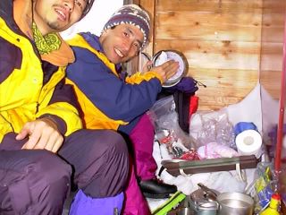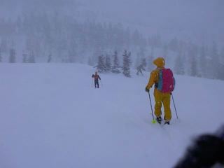 ここは自然園の中です。積雪は3メート以上あると思います、木が見えないから(うもれてて)。御覧のような悪天候ですぐ近くに穴があっても、全く見分け尽きませんでした。白一色(ホワイトアウトっていうのかな)で地面が下がっているのかあがっているのか分からず恐い思いをしました。